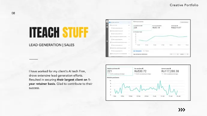 I have worked for my client's AI tech firm, focusing on extensive lead generation efforts. My contributions led to significant achievements in values. Secured Largest Client: Successfully secured the firm's largest client on a 1-year retainer basis.