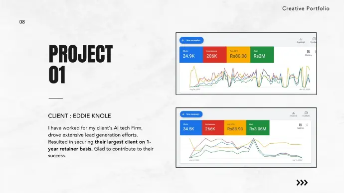 I have worked for my client's AI tech firm, focusing on extensive lead generation efforts. My contributions led to significant achievements in values. Secured Largest Client: Successfully secured the firm's largest client on a 1-year retainer basis.